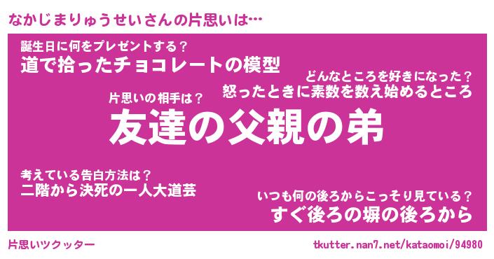 | 胡散臭い通販商品みたいなあだ名 | 『億万長者になれる水晶球…その名も「なかじまりゅうせい」』 |
