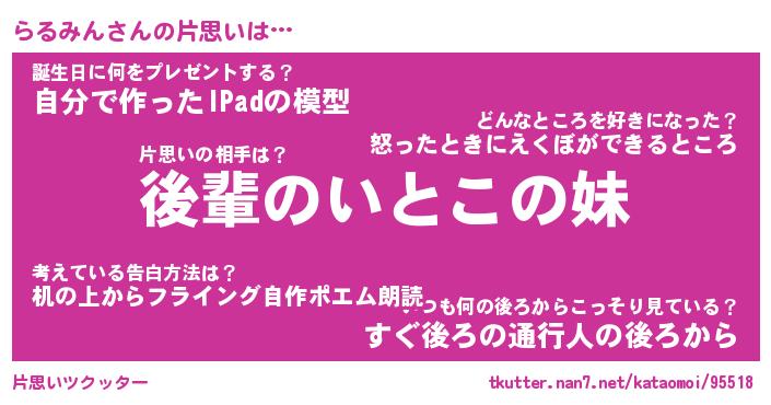 | ヘコむあだ名 | 『らるもー』『つくし』『らるぷりん』 |