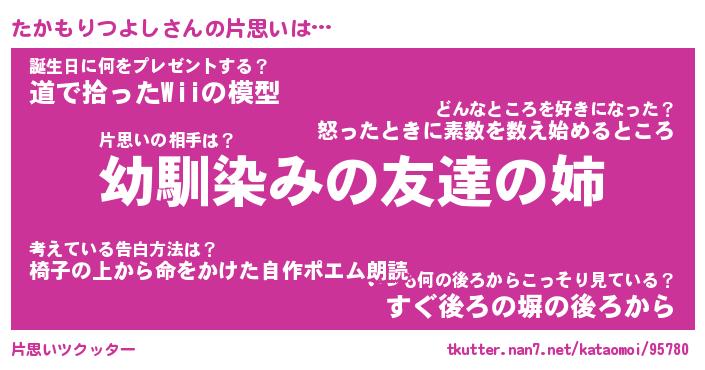 | 女子向けラノベタイトル風あだ名 | 『(仮)たかもりつよしのやんごとなき事情』 |