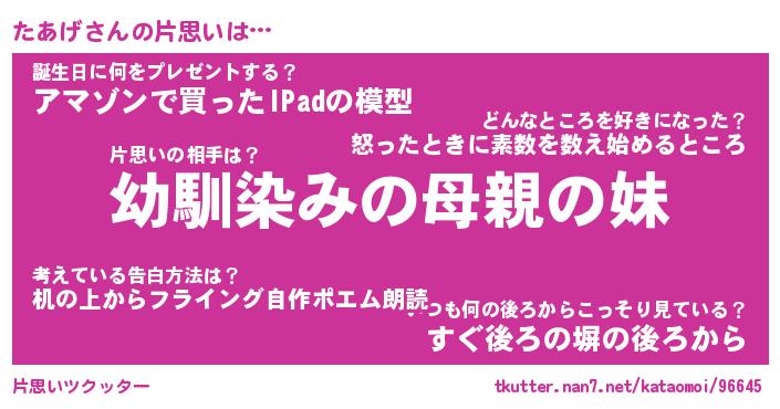 | 女子向けラノベタイトル風あだ名 | 『(仮)たあげのやんごとなき事情』 |