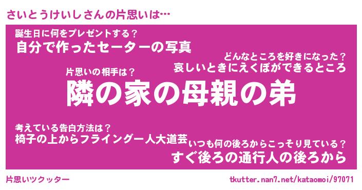 | 胡散臭い通販商品みたいなあだ名 | 『必ず成功するブレスレット…その名も「さいとうけいし」』 |
