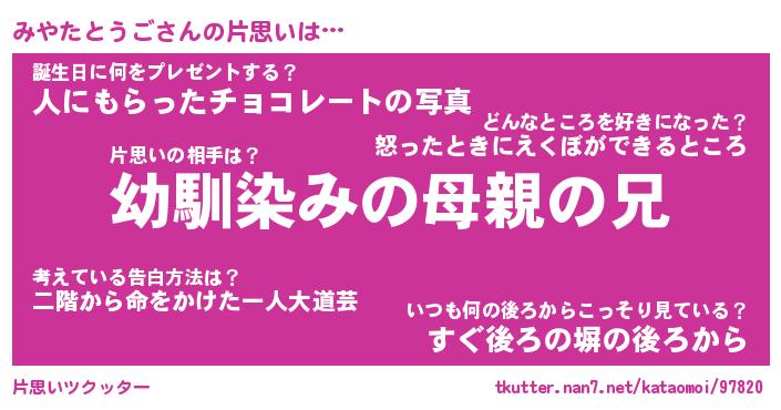| ヒーロー風カッコイイあだ名 | 『スーパーミヤタトウゴ』『炎刃騎士ミヤ』 |