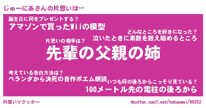 | ヘコむあだ名 | 『じゅにゅー』『なまこ酢』『じゅお』 |