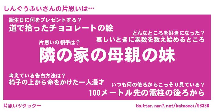 | 男性向けラノベタイトル風あだ名 | 『しんぐうふいの憂鬱』 |