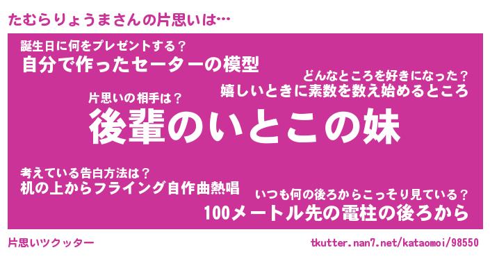 | 女子向けラノベタイトル風あだ名 | 『誰かこのたむらりょうまを説明してください! ~契約から始まるウェディング~』 |