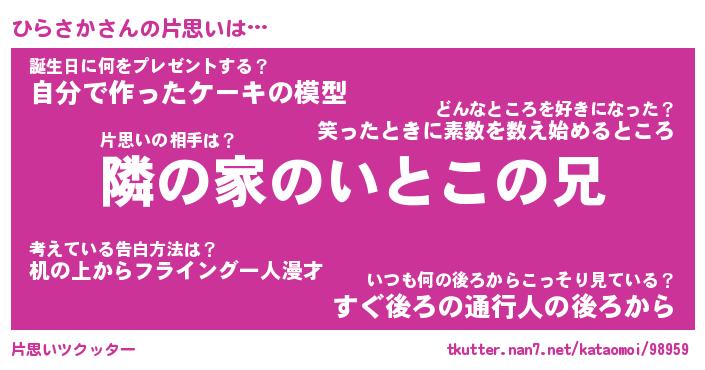 | 意味不明あだ名 | 『ペロリンひらさか』『永久保存ひらさか』 |
