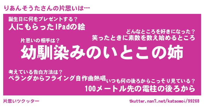 | 胡散臭い通販商品みたいなあだ名 | 『必ず成功する霊験あらたかなお札…その名も「りあんそうた」』 |