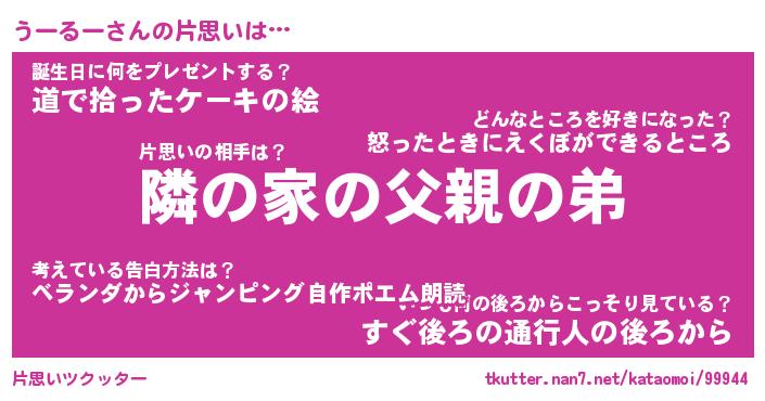 | 男性向けラノベタイトル風あだ名 | 『うーるーの憂鬱』 |
