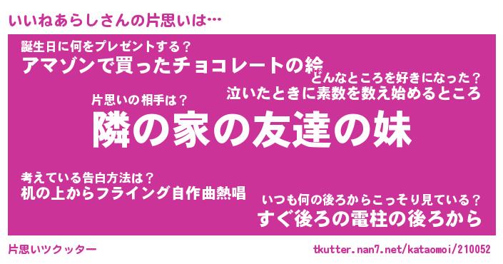 | 男性向けラノベタイトル風あだ名 | 『いいねあらしの憂鬱』 |