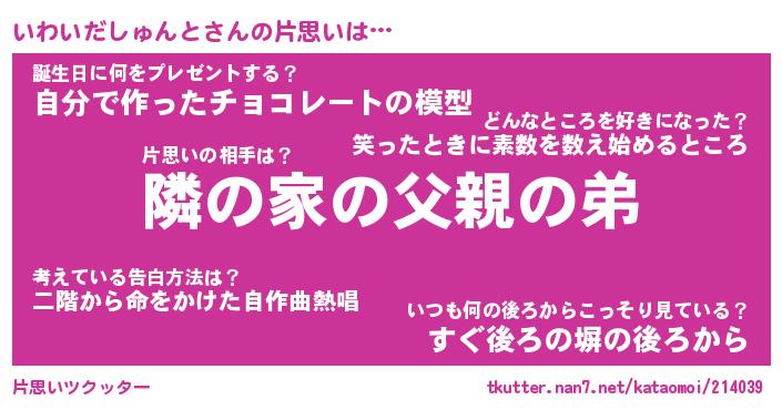 | ピコ太郎風あだ名 | 『イコ一郎』『ピイ太郎』『イワ史郎』 |