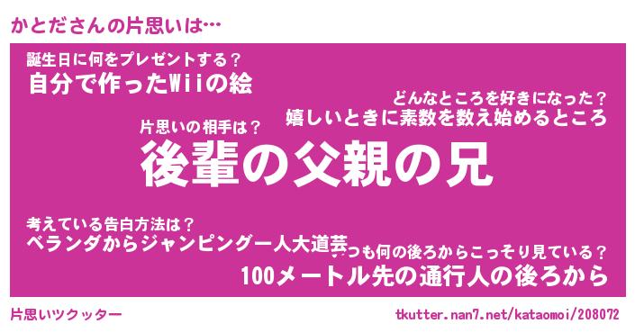 | ヘコむあだ名 | 『かとにゅー』『つくし』『かと太郎』 |