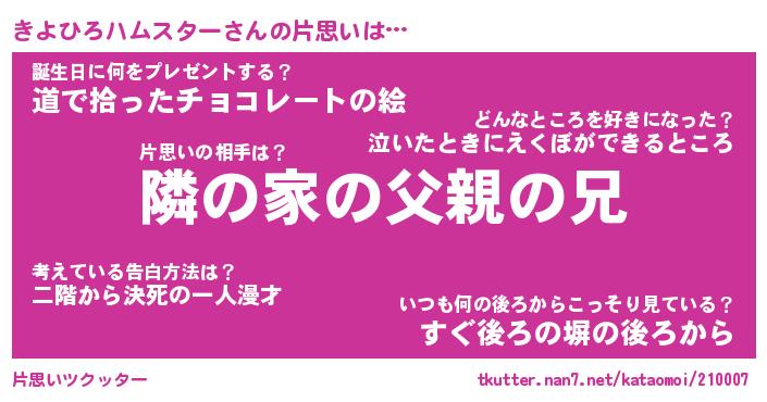 | 男性向けラノベタイトル風あだ名 | 『きよひろハムスターの憂鬱』 |