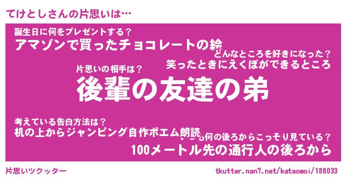 | 意味不明あだ名 | 『ペロリンてけとし』『永久保存てけとし』 |