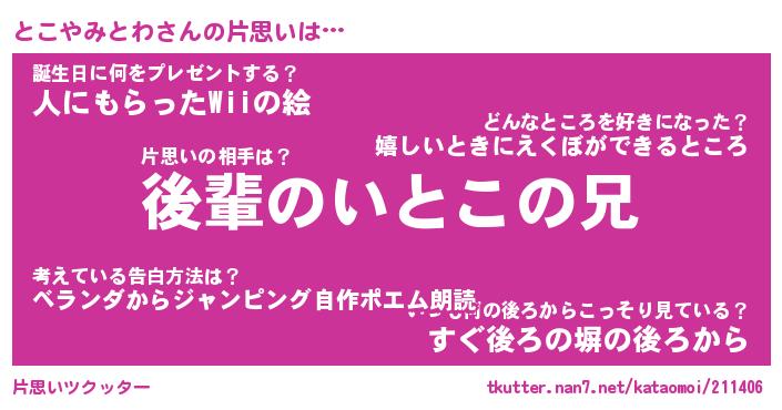 | 恥ずかしいあだ名 | 『プリティーとこやみとわ』『とこっちょ』 |
