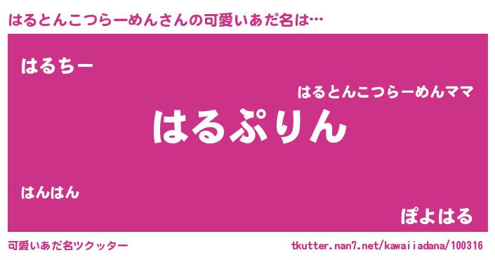 | 男性向けラノベタイトル風あだ名 | 『はるとんこつらーめん~年齢イコール彼女いない歴の魔法使い~』 |