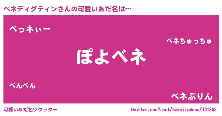 | 女子向けラノベタイトル風あだ名 | 『ベネディグティンが死なない童話 林檎のベネディグティンの診療簿』 |
