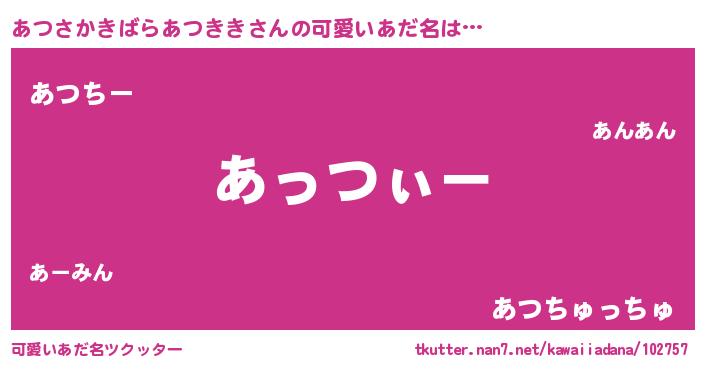 | 女子向けラノベタイトル風あだ名 | 『あつさかきばらあつききの卵を拾いまして』 |