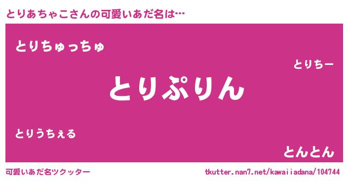 | 女子向けラノベタイトル風あだ名 | 『とりあちゃこの玉の輿計画!』 |