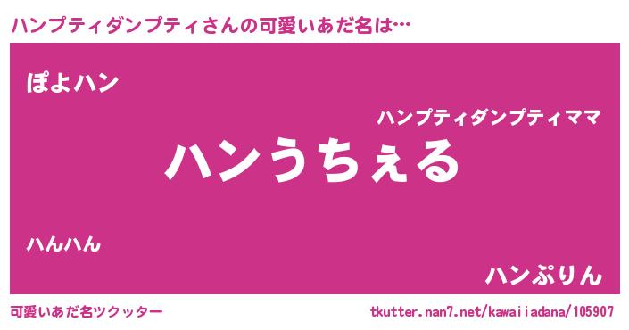 | 男性向けラノベタイトル風あだ名 | 『Re:ハンプティダンプティから始める異世界生活』 |