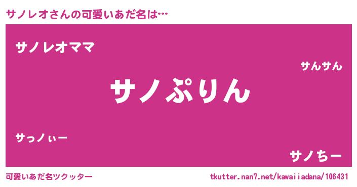 | 男性向けラノベタイトル風あだ名 | 『サノレオ~年齢イコール彼女いない歴の魔法使い~』 |