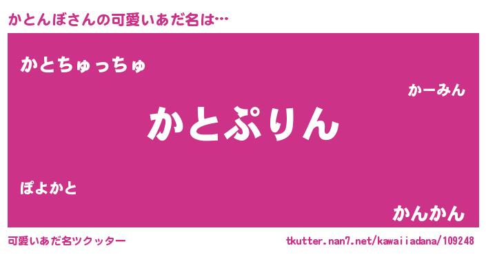 | 男性向けラノベタイトル風あだ名 | 『かとんぼ~年齢イコール彼女いない歴の魔法使い~』 |