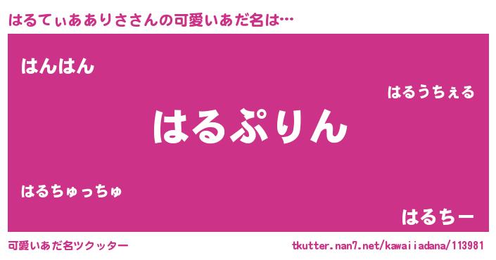 | 男性向けラノベタイトル風あだ名 | 『はるてぃあありさ~年齢イコール彼女いない歴の魔法使い~』 |