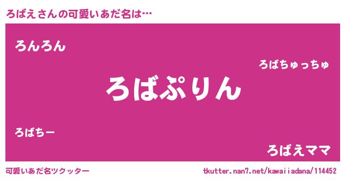 | 男性向けラノベタイトル風あだ名 | 『ろばえ~年齢イコール彼女いない歴の魔法使い~』 |