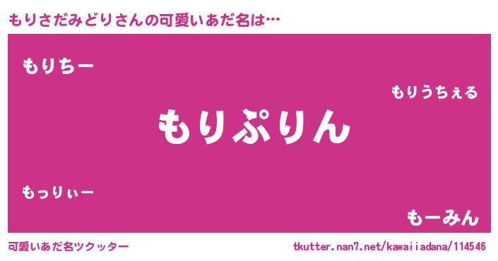 | 男性向けラノベタイトル風あだ名 | 『もりさだみどり~年齢イコール彼女いない歴の魔法使い~』 |