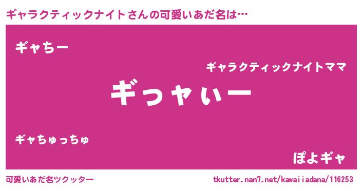 | 男性向けラノベタイトル風あだ名 | 『ギャラクティックナイトの嫁は女の子じゃないと思った?』 |