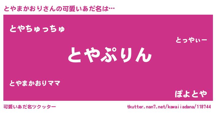 | 男性向けラノベタイトル風あだ名 | 『とやまかおり~年齢イコール彼女いない歴の魔法使い~』 |