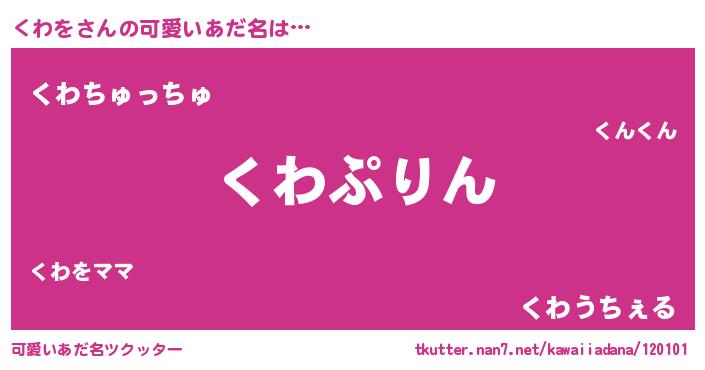 | 意味不明あだ名 | 『めかぶ科くわを属』『自称くわを』 |