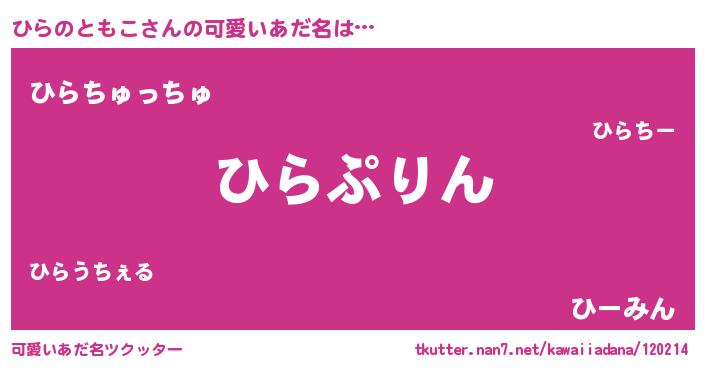 | 女子向けラノベタイトル風あだ名 | 『ひらのともこの玉の輿計画!』 |