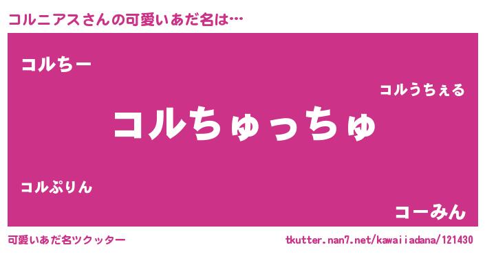 | 男性向けラノベタイトル風あだ名 | 『おまえをオタクにしてやるから、俺をコルニアスにしてくれ! 』 |