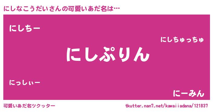 | 男性向けラノベタイトル風あだ名 | 『転生したらにしなこうだいだった件』 |