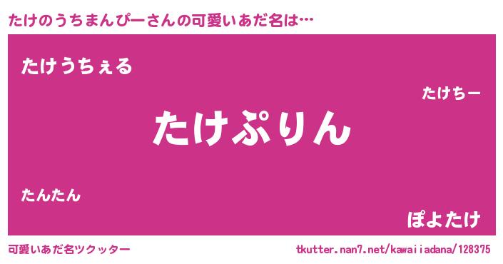 | 男性向けラノベタイトル風あだ名 | 『たけのうちまんぴー~年齢イコール彼女いない歴の魔法使い~』 |