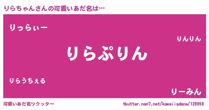 | 男性向けラノベタイトル風あだ名 | 『りらちゃん~年齢イコール彼女いない歴の魔法使い~』 |