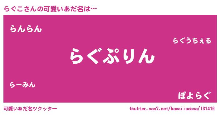 | 意味不明あだ名 | 『めかぶ科らぐこ属』『ペロリンらぐこ』 |