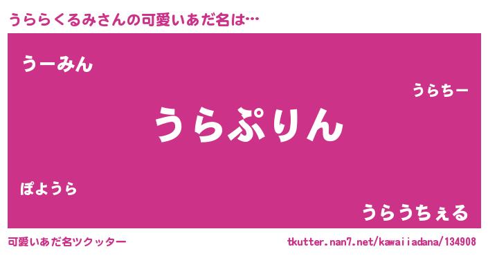 | 男性向けラノベタイトル風あだ名 | 『うららくるみ~年齢イコール彼女いない歴の魔法使い~』 |