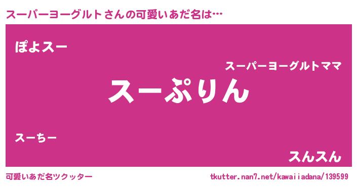| 男性向けラノベタイトル風あだ名 | 『スーパーヨーグルト~年齢イコール彼女いない歴の魔法使い~』 |