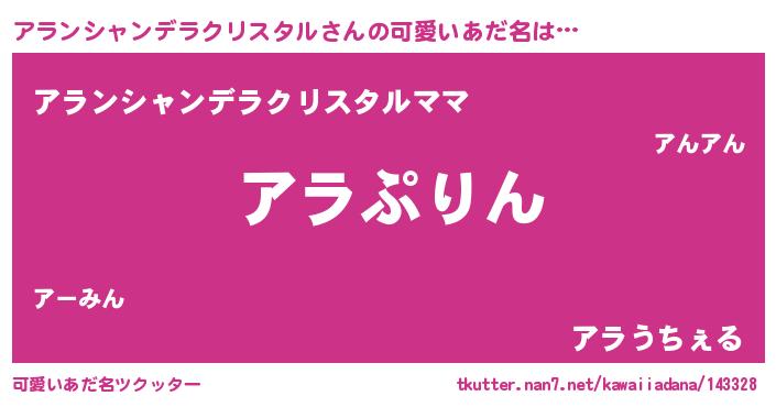 | 男性向けラノベタイトル風あだ名 | 『アランシャンデラクリスタルスレイヤー』 |