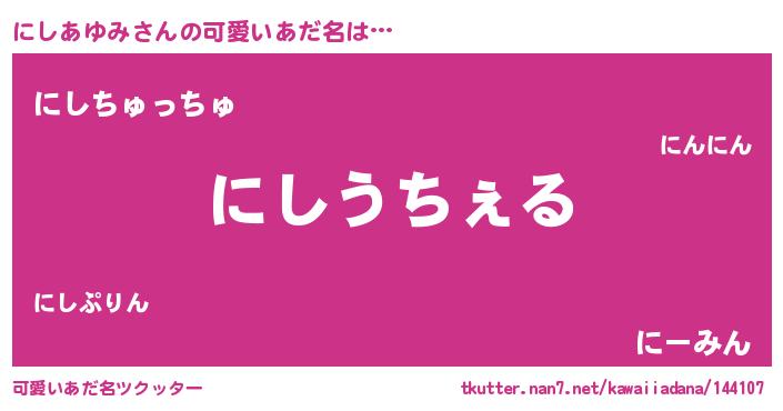 | 意味不明あだ名 | 『自称にしあゆみ』『ペロリンにしあゆみ』 |