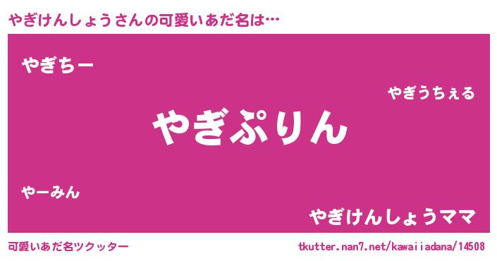 | 男性向けラノベタイトル風あだ名 | 『やぎけんしょう~年齢イコール彼女いない歴の魔法使い~』 |