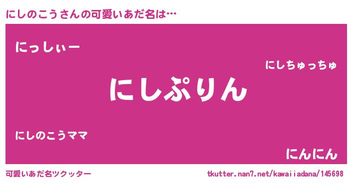 | 男性向けラノベタイトル風あだ名 | 『にしのこう~年齢イコール彼女いない歴の魔法使い~』 |