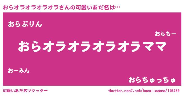 | 男性向けラノベタイトル風あだ名 | 『おらオラオラオラオラという概念が存在しない退屈な世界 』 |