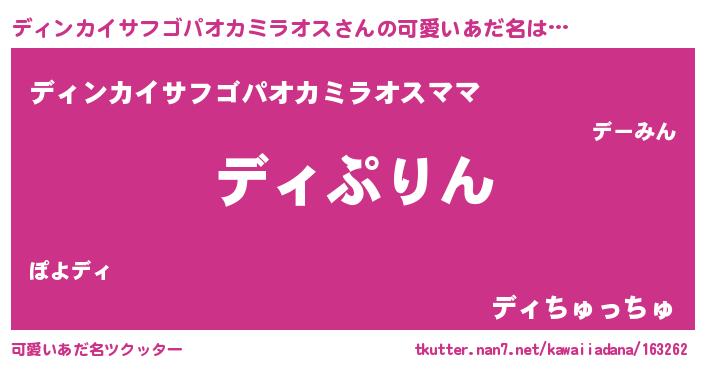 | 男性向けラノベタイトル風あだ名 | 『ディンカイサフゴパオカミラオス~年齢イコール彼女いない歴の魔法使い~』 |