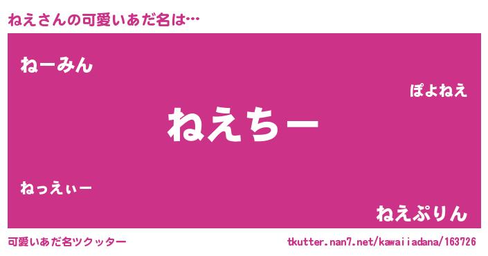 | 女子向けラノベタイトル風あだ名 | 『ねえの雑貨屋さん』『ねえは平凡を望む』 |