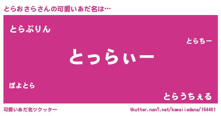 | 男性向けラノベタイトル風あだ名 | 『とらおさらの嫁は女の子じゃないと思った?』 |