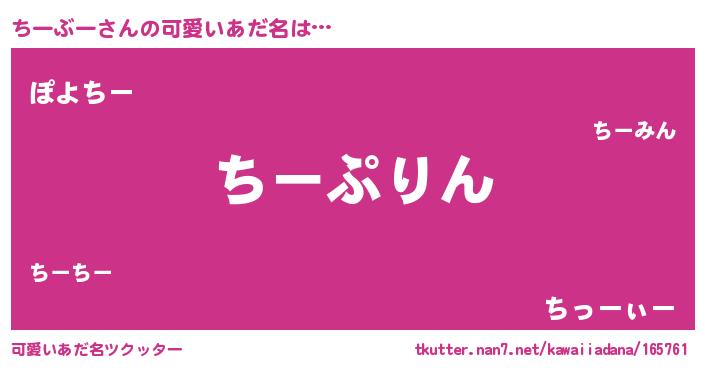 | 男性向けラノベタイトル風あだ名 | 『ちーぶー~年齢イコール彼女いない歴の魔法使い~』 |
