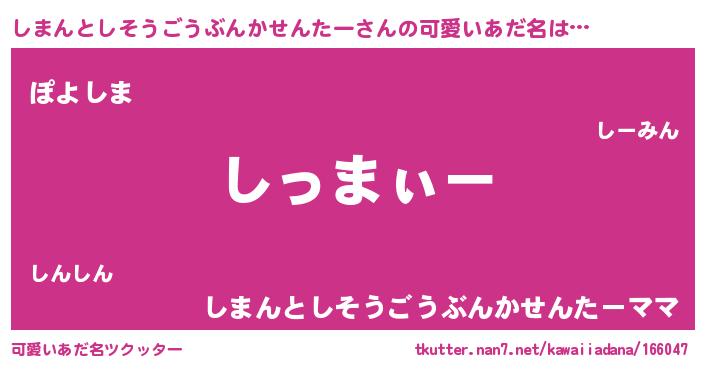 | 女子向けラノベタイトル風あだ名 | 『しまんとしそうごうぶんかせんたーの卵を拾いまして』 |