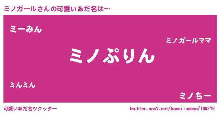 | 女子向けラノベタイトル風あだ名 | 『ミノガールの玉の輿計画!』 |